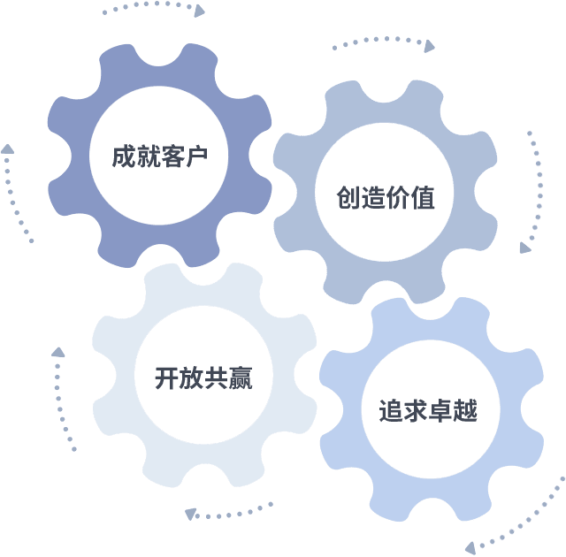 成就客户是一切决策的出发点,,创造价值是衡量所有工作的标准,,,追求卓越是我们做事做人的态度,,,,开放共赢是我们的格局也是最终的结果。。价值观的齿轮环环相扣,,推动着组织里的每个人不断向前。。
